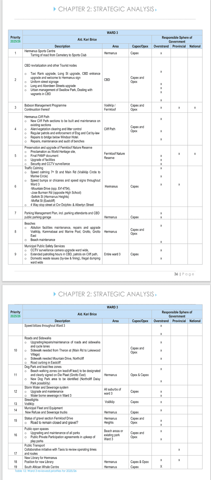 Not much about the Strategic Environmental Management Framework. The pristine environmental elements in the Overstrand Region are major fundamental assets for OSM and require more focus and attention in this document. The Protected Area Management Plan (PAMP) for the Fernkloof Nature Reserve (FNR) was completed in 2024, but is unfortunately still a very broad document lacking specifics and like many of these plans, it is not user-friendly.